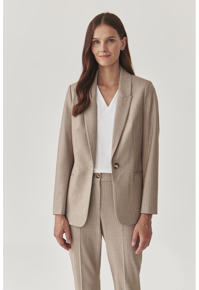 - alb murdar Stil: elegant Croiala: regular fit Material: sintetic Imprimeu: dungi Guler: cu revere decupate Lungime maneca: maneca lunga Buzunare: 2 cu refilet Sistem inchidere: nasturi Compozitie Exterior: 81% poliester