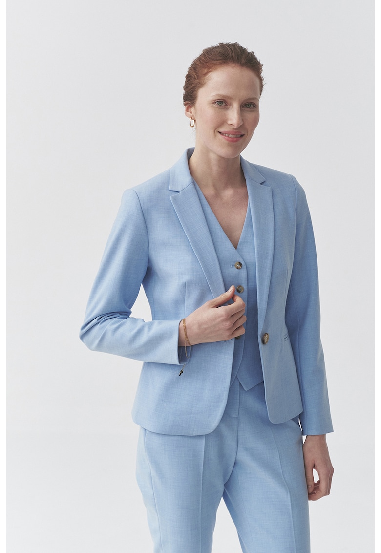 Caracteristici Culoare: albastru lavanda Stil: elegant Croiala: regular fit Material: poliester Imprimeu: uni Guler: cu revere decupate Lungime maneca: maneca lunga Buzunare: 2 Sistem inchidere: nasturi Compozitie Exterior: 65% poliester