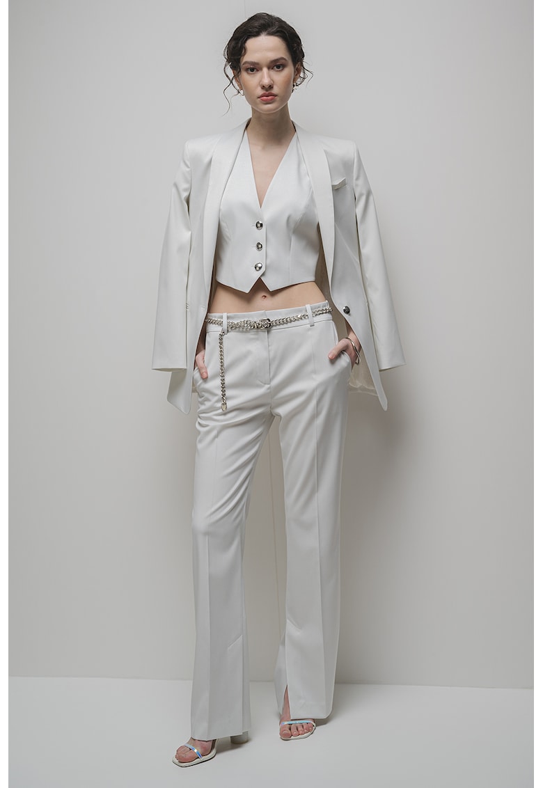 Caracteristici Culoare: alb fildes Stil: elegant Croiala: regular fit Material: sintetic Imprimeu: uni Guler: cu revere Lungime maneca: maneca lunga Sistem inchidere: nasturi Compozitie Exterior: 62% poliester
