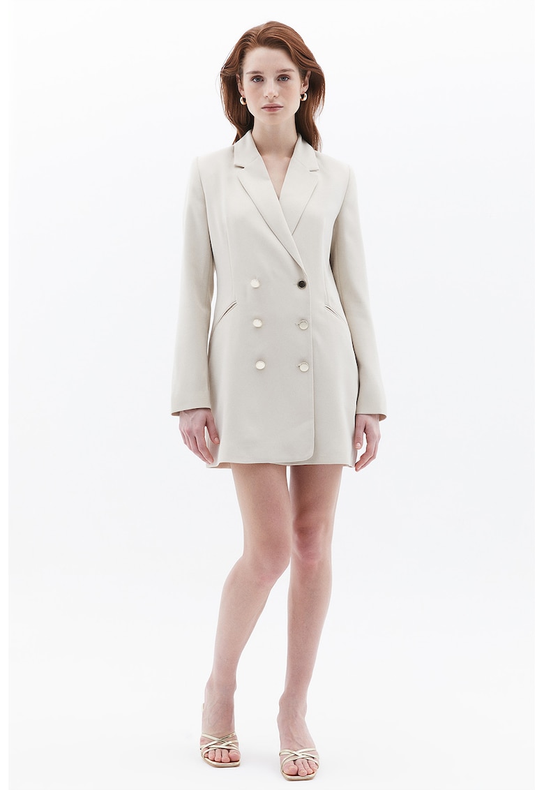 Caracteristici Culoare: maro taupe deschis Stil: elegant Croiala: regular fit Material: poliester Imprimeu: uni Guler: cu revere decupate Lungime maneca: maneca lunga Buzunare: 2 oblice Detalii: design cu 2 nasturi Sistem inchidere: nasturi Compozitie Exterior: 100% poliester
