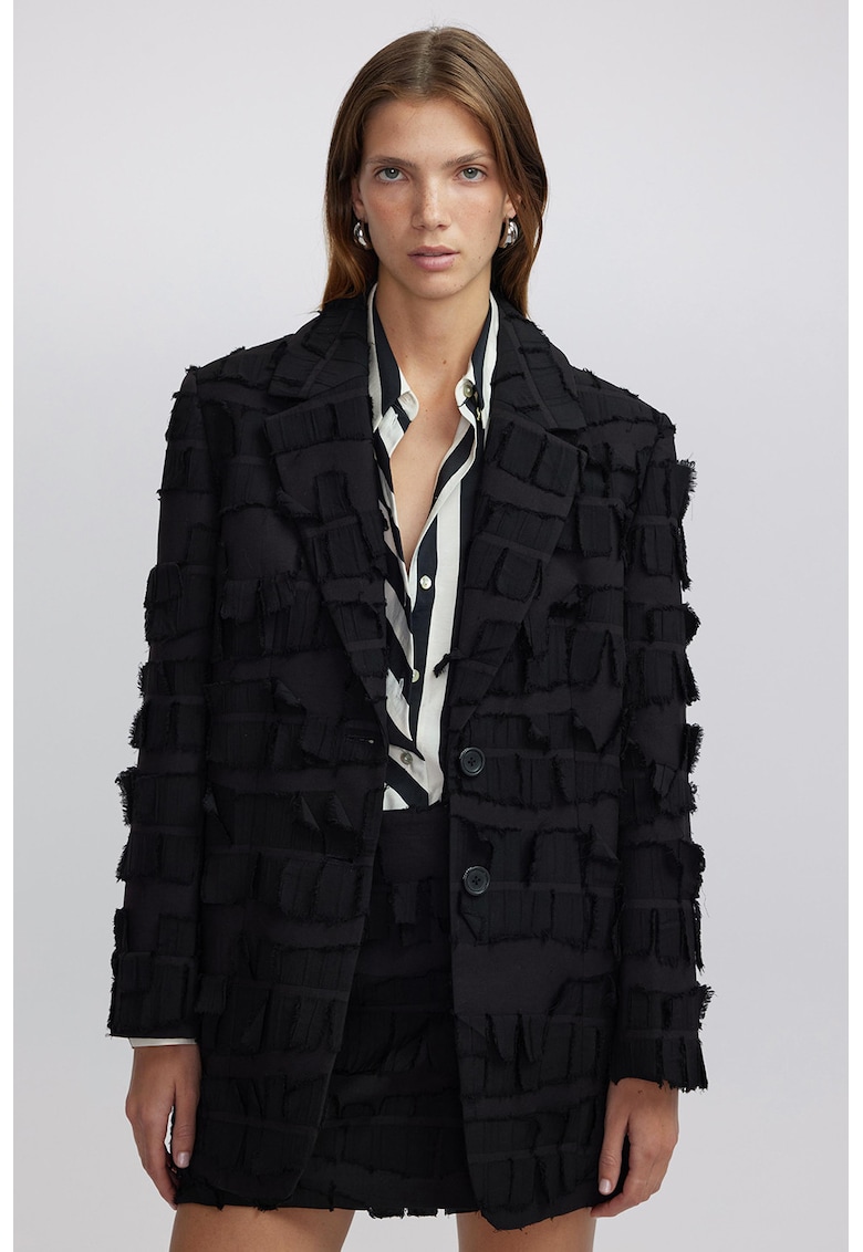 - elastan Imprimeu: uni Guler: guler cu revere Lungime maneca: maneca lunga Sistem inchidere: nasturi Compozitie Exterior: 38% viscoza
