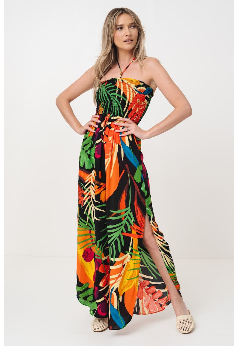 - fucsia Material: viscoza Imprimeu: tropical Decolteu: halter Lungime maneca: fara maneca Detalii: insertie elastica pe partea din spate Compozitie Exterior: 100% viscoza Info model Modelul poarta un produs de marimea S. Marimi model: 174 cm inaltime