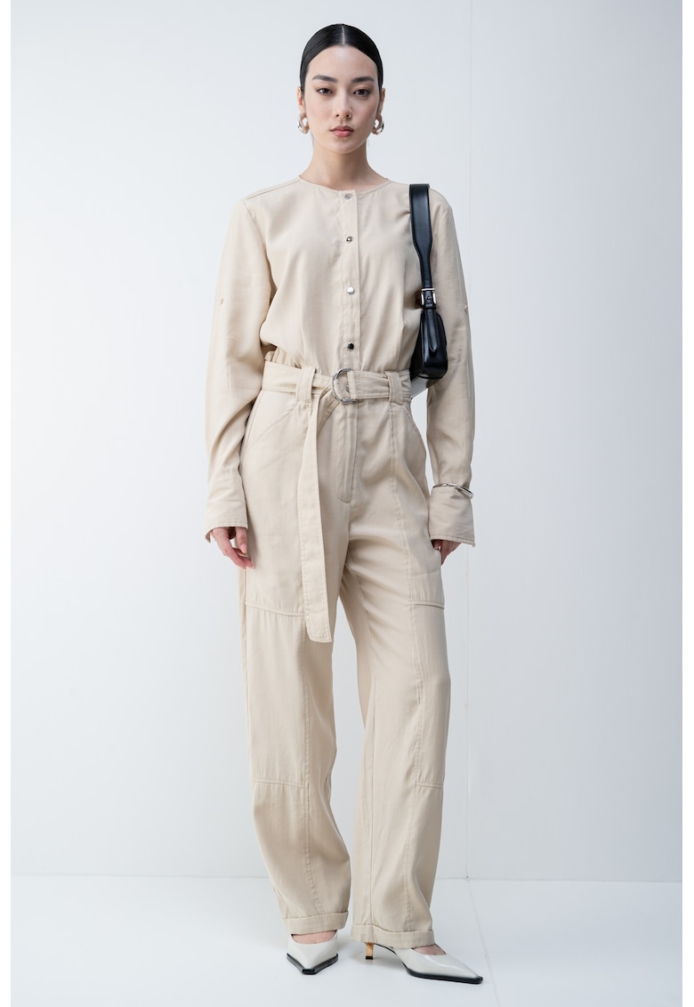Caracteristici generale Culoare: camel Croiala: regular fit Stil: casual Material: viscoza Lungime maneca: maneca lunga Lungime pantaloni: lungi Imprimeu: uni Detalii: curea in talie Compozitie Exterior: 91% viscoza