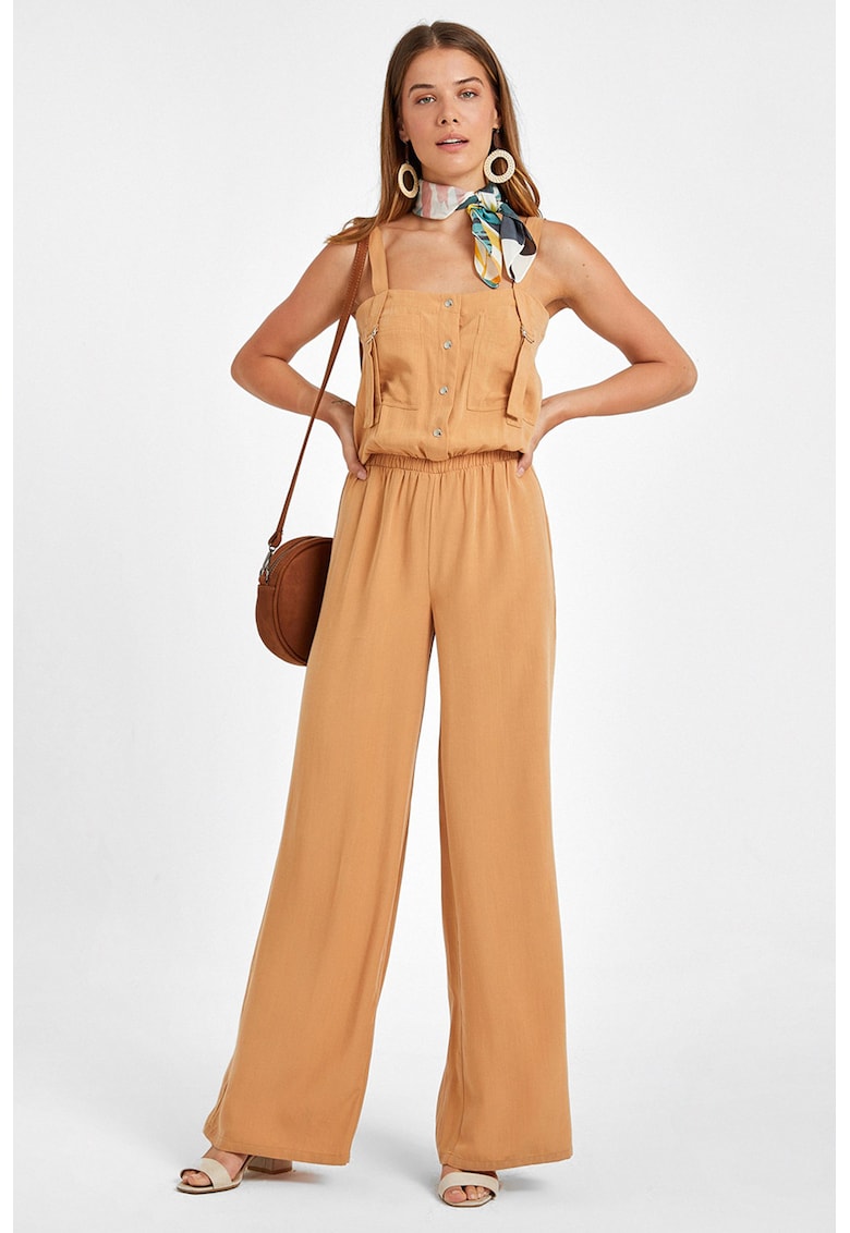 Caracteristici generale Culoare: piersica Croiala: larga Stil: casual Material: lyocell Lungime maneca: fara maneca Lungime pantaloni: lungi Imprimeu: uni Sistem inchidere: capse Detalii: talie elastica