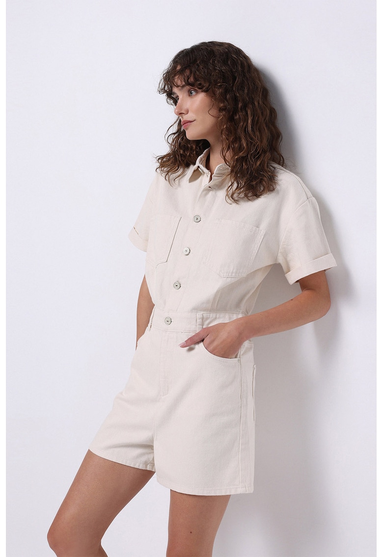 Caracteristici generale Culoare: bej deschis Croiala: regular fit Stil: casual Material: bumbac Lungime maneca: maneca scurta Lungime pantaloni: scurti Imprimeu: uni Sistem inchidere: nasturi Detalii: 2 buzunare pe piept Compozitie Exterior: 100% bumbac