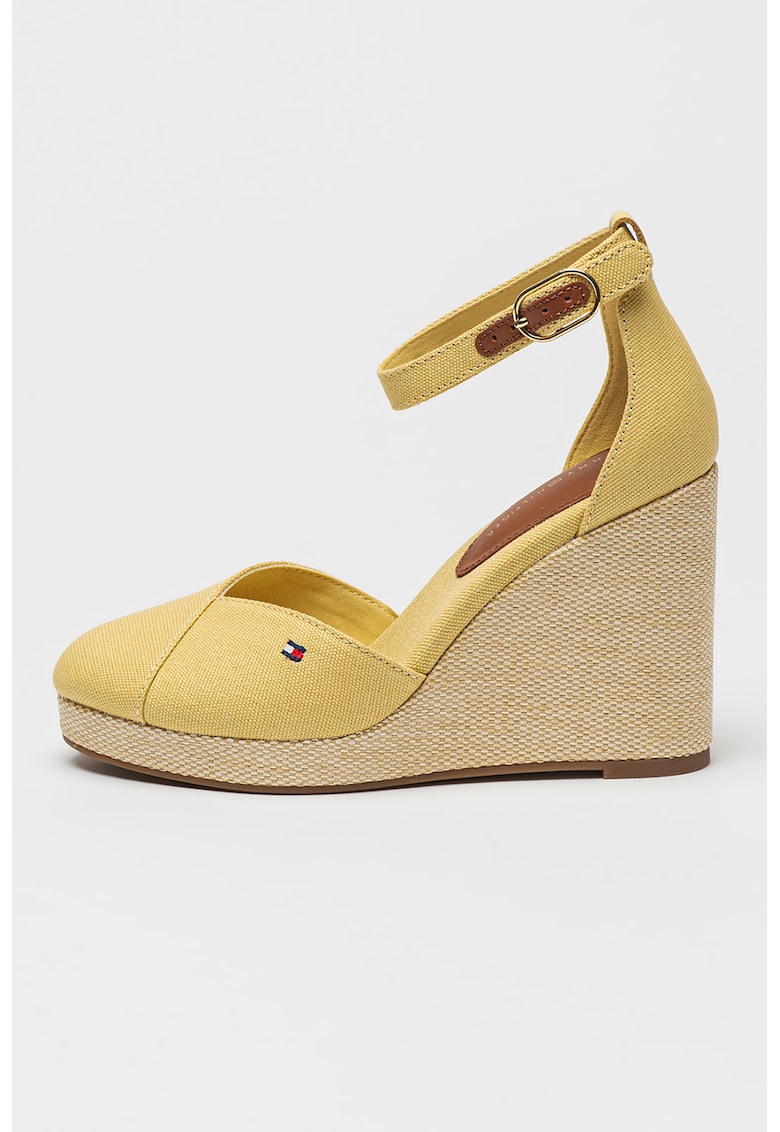 Caracteristici Tip: cu platforma Culoare: galben Material: textil Imprimeu: uni Stil: casual Varf: rotund Tip talpa: wedge Culoare elemente metalice: auriu Detalii: detaliu cu logo Compozitie Partea superioara: material textil Material interior: textil Material talpa: alte materiale Dimensiuni Platforma spate: 10.5 cm