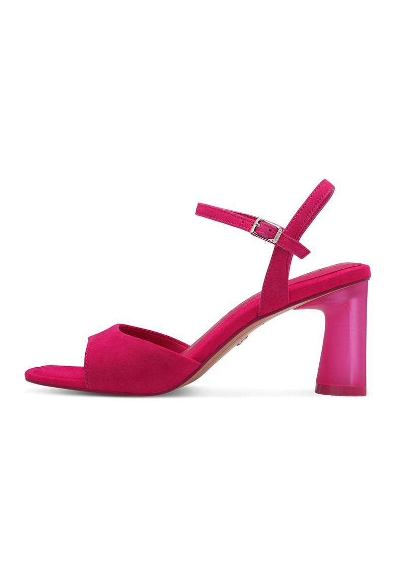 Caracteristici Tip: cu toc Culoare: roz zmeuriu Material: piele intoarsa Imprimeu: uni Stil: elegant Tip toc: masiv Culoare elemente metalice: argintiu Sistem inchidere: catarama Compozitie Partea superioara: piele intoarsa Material interior: alte materiale Material talpa: alte materiale Dimensiuni Inaltime toc: 7 cm