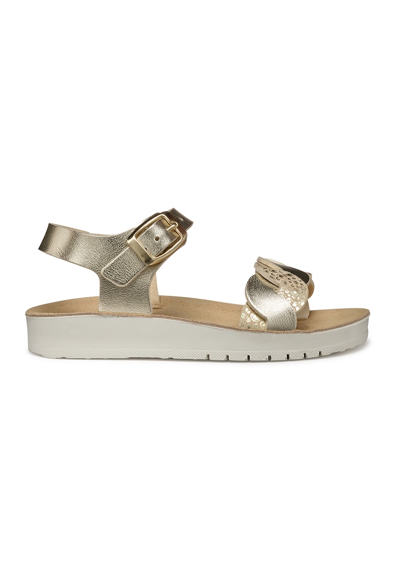 Caracteristici Culoare: auriu Imprimeu: uni Material: piele ecologica Sistem inchidere: catarama Tip talpa: plata Detalii: geox respira technology Compozitie Partea superioara: alte materiale Material interior: alte materiale