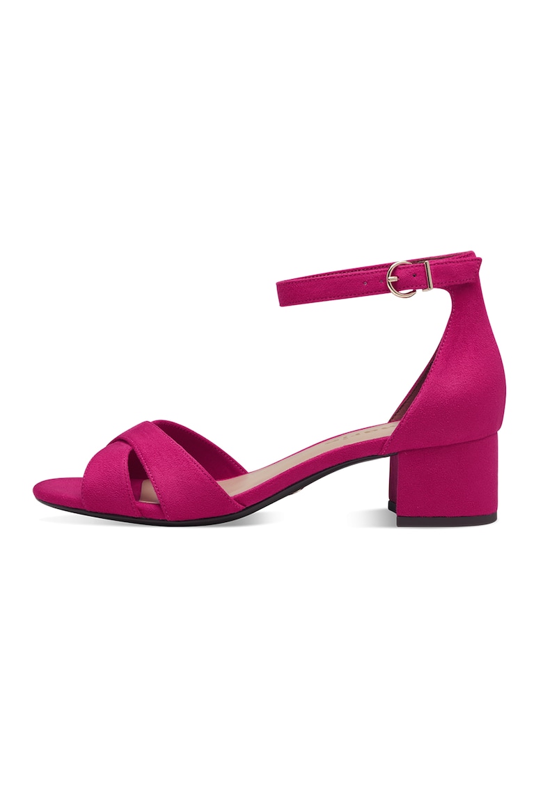 Caracteristici Tip: cu toc Culoare: fucsia Material: piele intoarsa Imprimeu: uni Stil: elegant Varf: rotund Tip toc: masiv Culoare elemente metalice: auriu Sistem inchidere: catarama Compozitie Partea superioara: alte materiale Material interior: alte materiale