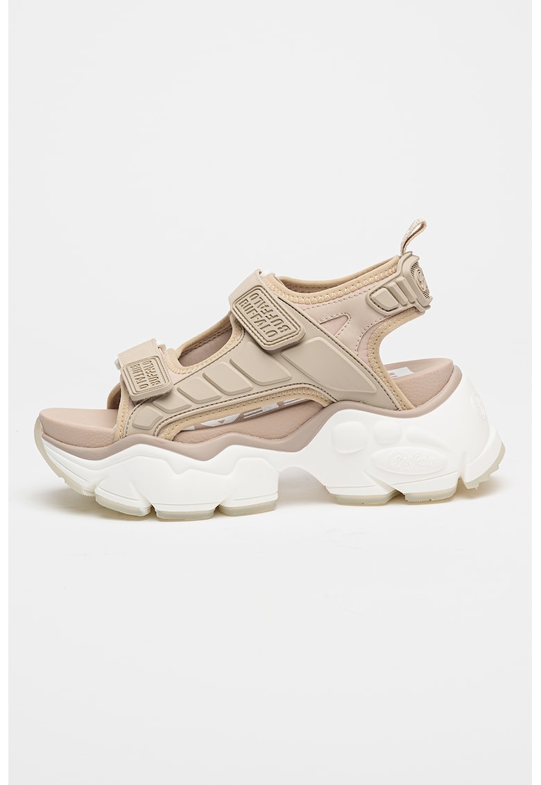 Caracteristici Tip: cu platforma Culoare: bej deschis Material: piele ecologica Imprimeu: uni Stil: casual Tip talpa: demi-wedge Culoare elemente metalice: gri metalizat Sistem inchidere: velcro Compozitie Partea superioara: alte materiale