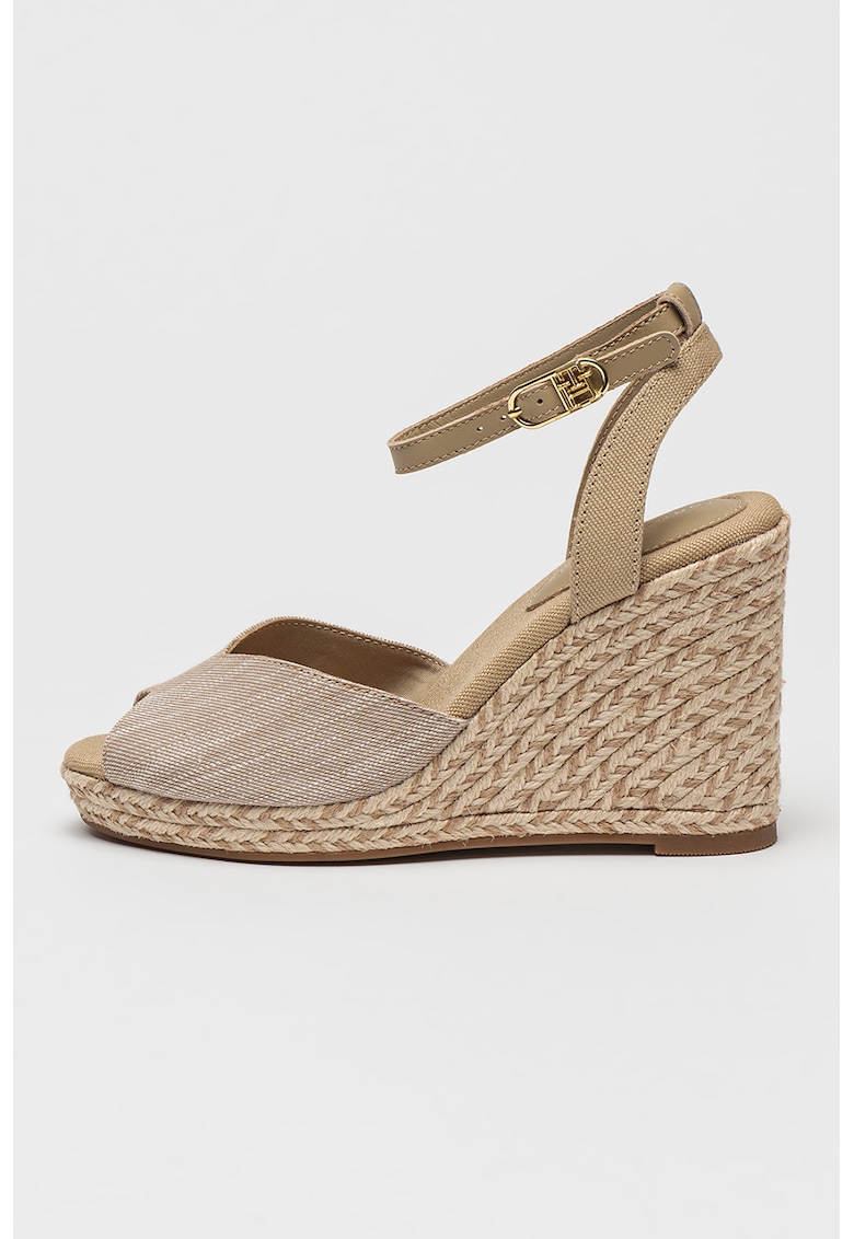 Caracteristici Tip: cu platforma Culoare: bej Material: textil Imprimeu: uni Stil: casual Tip talpa: wedge Culoare elemente metalice: auriu Sistem inchidere: catarama Compozitie Partea superioara: material textil Material interior: alte materiale Material talpa: alte materiale Dimensiuni Platforma spate: 11 cm