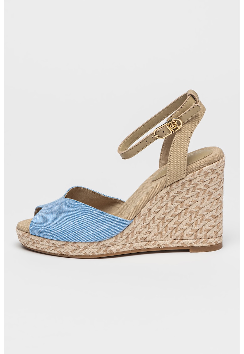 - albastru deschis Material: textil Imprimeu: uni Stil: casual Tip talpa: wedge Culoare elemente metalice: auriu Sistem inchidere: catarama Compozitie Partea superioara: material textil Material interior: alte materiale Material talpa: alte materiale Dimensiuni Platforma spate: 11 cm