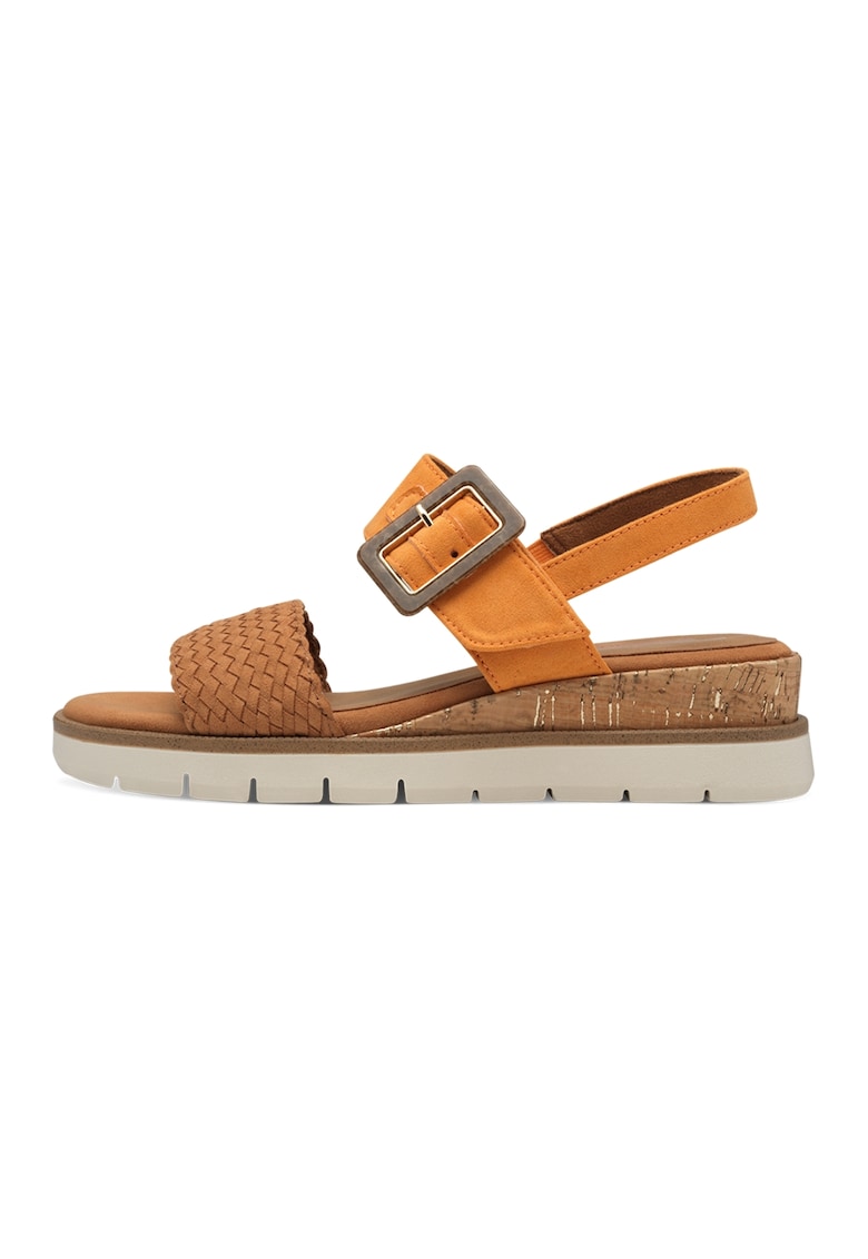Caracteristici Tip: cu talpa joasa Culoare: portocaliu stins Material: textil Stil: casual Varf: rotund Tip talpa: wedge Culoare elemente metalice: argintiu Sistem inchidere: catarama Compozitie Partea superioara: material textil Material interior: textil Material talpa: alte materiale Dimensiuni Platforma spate: 4.5 cm
