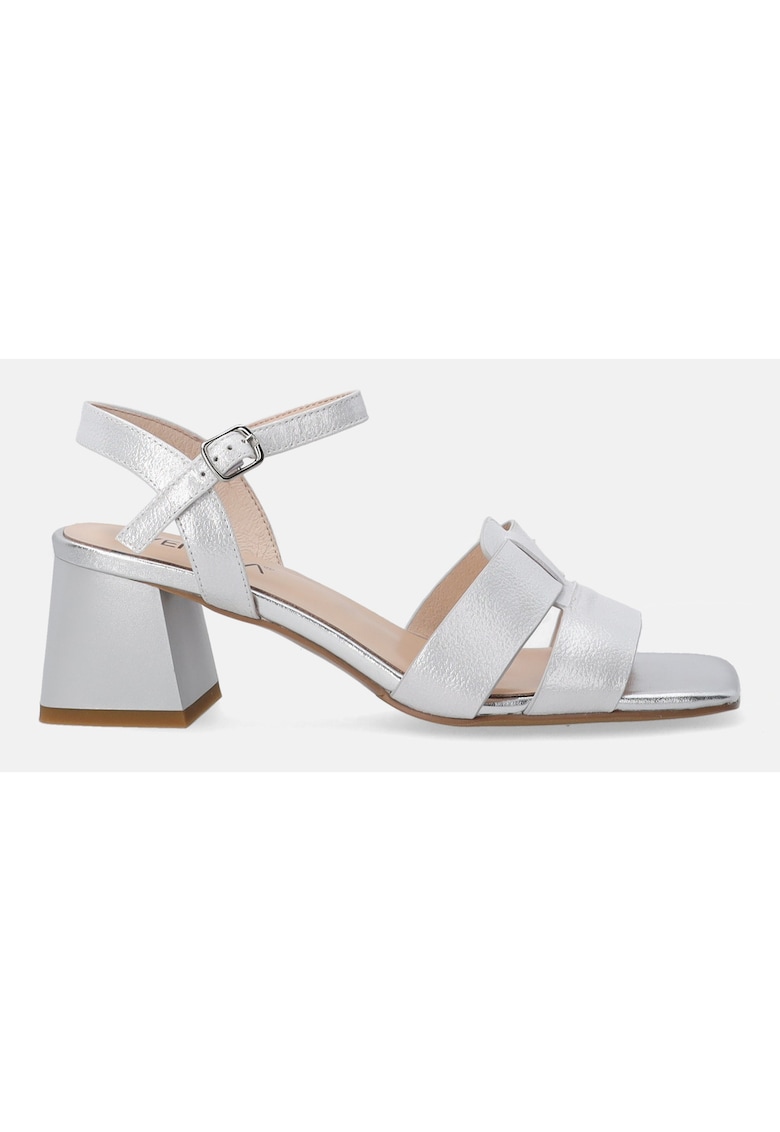 Caracteristici Tip: cu toc Culoare: argintiu Material: piele naturala Stil: casual Varf: patrat Tip toc: masiv Culoare elemente metalice: argintiu Detalii: aspect metalizat Sistem inchidere: catarama Compozitie Partea superioara: piele Material interior: piele Material talpa: 100% sintetic Dimensiuni Inaltime toc: 6 cm