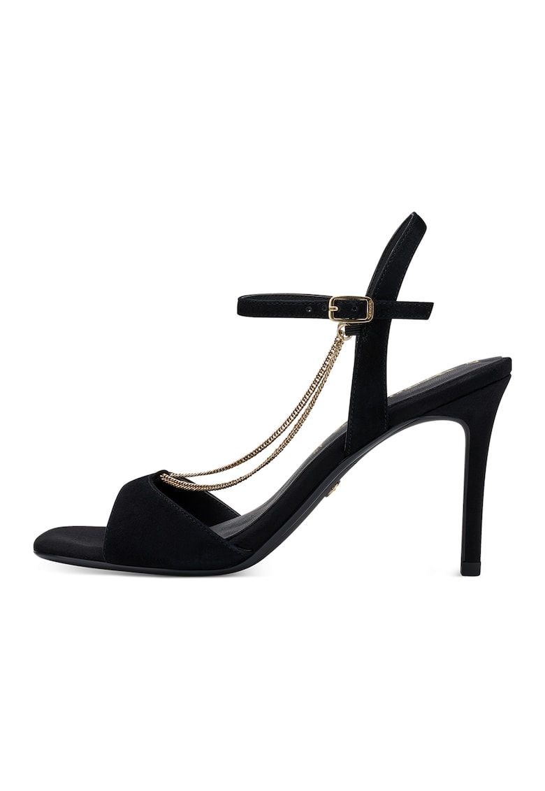 Caracteristici Tip: cu toc Culoare: negru Material: piele naturala Imprimeu: uni Stil: casual Tip toc: stiletto Culoare elemente metalice: auriu Sistem inchidere: catarama Compozitie Partea superioara: piele Material interior: alte materiale Material talpa: alte materiale Dimensiuni Inaltime toc: 9.5 cm