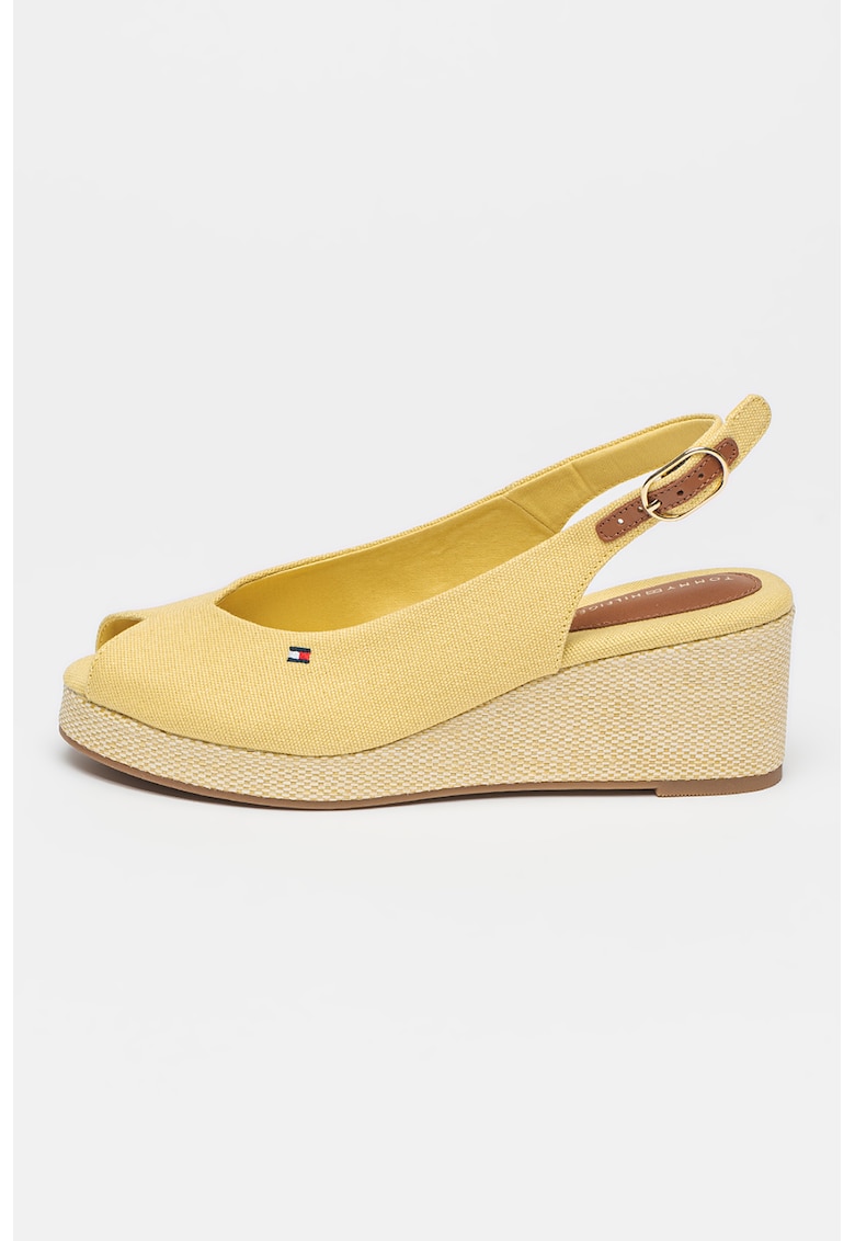 Caracteristici Tip: cu platforma Culoare: galben Material: textil Imprimeu: uni Stil: casual Tip talpa: wedge Culoare elemente metalice: auriu Sistem inchidere: catarama Compozitie Partea superioara: material textil Material interior: textil Material talpa: alte materiale Dimensiuni Platforma spate: 6 cm