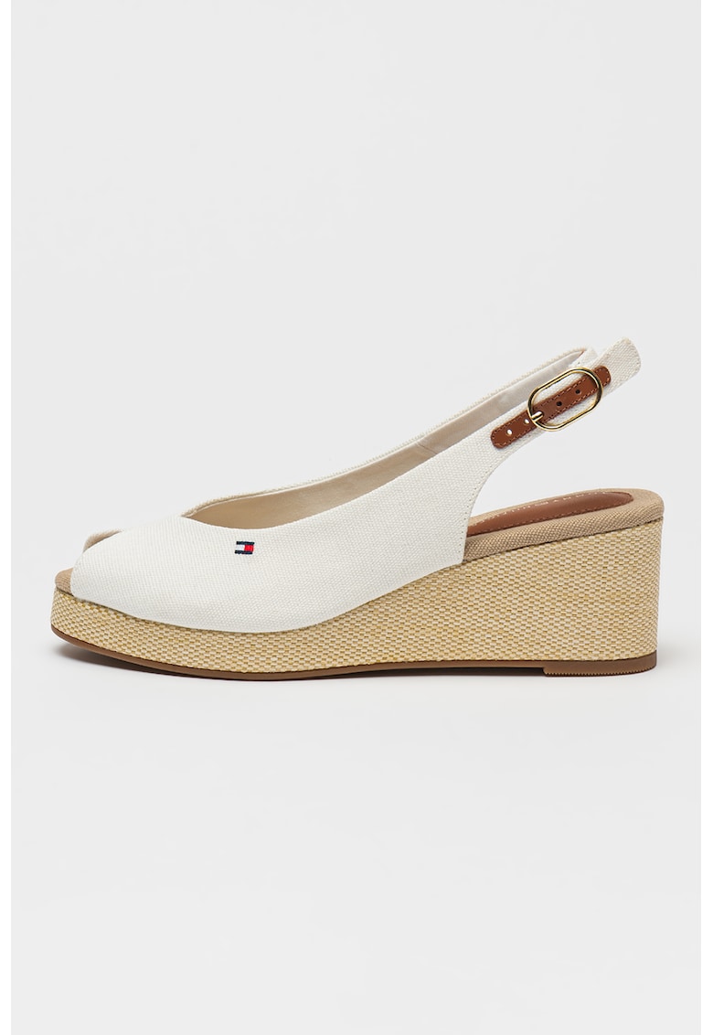 Caracteristici Tip: cu platforma Culoare: alb murdar Material: textil Imprimeu: uni Stil: casual Tip talpa: wedge Culoare elemente metalice: auriu Sistem inchidere: catarama Compozitie Partea superioara: material textil Material interior: textil Material talpa: alte materiale Dimensiuni Platforma spate: 6 cm