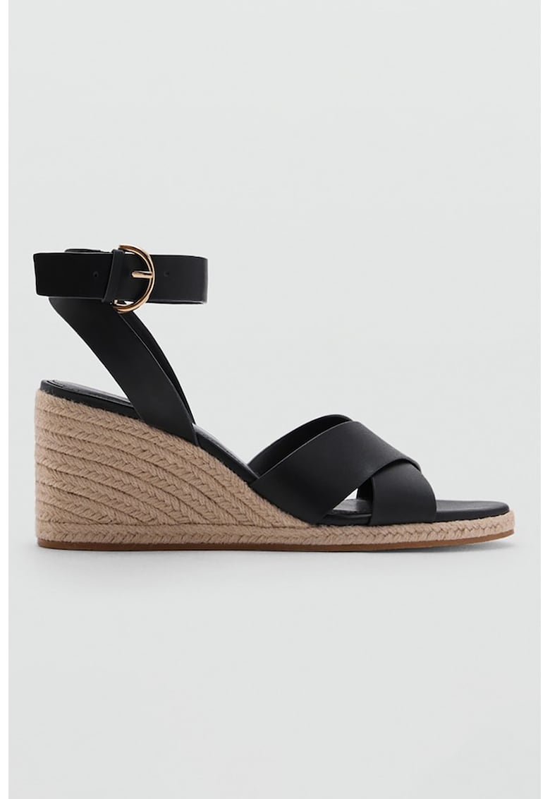 Caracteristici Tip: cu platforma Culoare: negru Material: sintetic Imprimeu: uni Stil: casual Varf: rotund Tip talpa: wedge Culoare elemente metalice: auriu Sistem inchidere: catarama Compozitie Partea superioara: alte materiale Material interior: textil Material talpa: alte materiale Dimensiuni Platforma spate: 7 cm