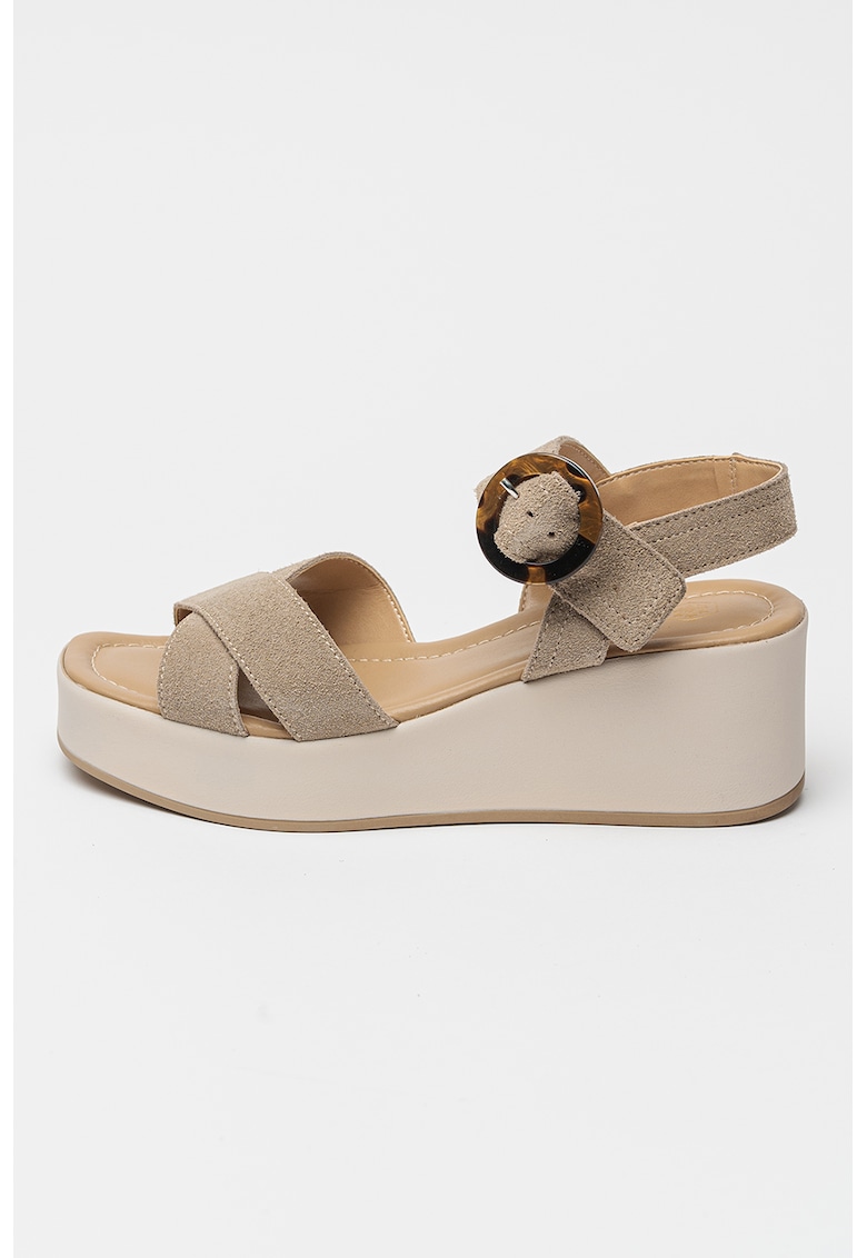 Caracteristici Tip: cu platforma Culoare: maro nisip Material: piele intoarsa Imprimeu: uni Stil: casual Varf: patrat Tip talpa: wedge Culoare elemente metalice: auriu Sistem inchidere: catarama Compozitie Partea superioara: piele intoarsa Material interior: piele naturala Material talpa: alte materiale Dimensiuni Platforma spate: 6 cm