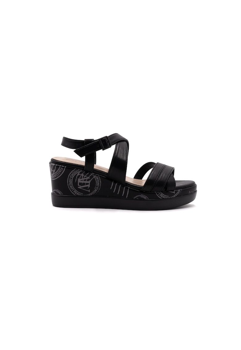 Caracteristici Tip: cu platforma Culoare: negru Material: textil Imprimeu: logo Stil: casual Tip talpa: wedge Culoare elemente metalice: negru Sistem inchidere: catarama Compozitie Partea superioara: piele ecologica Material interior: alte materiale Material talpa: alte materiale