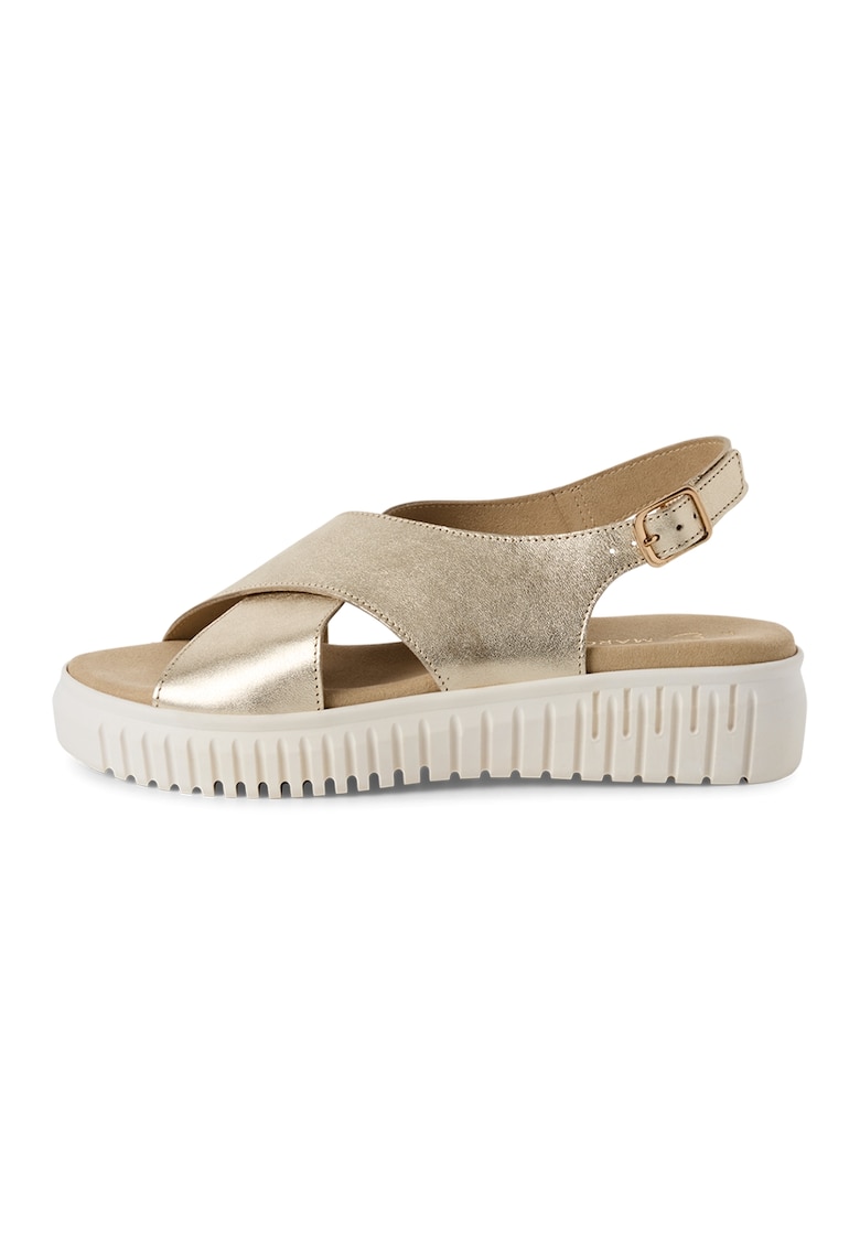 Caracteristici Tip: cu platforma Culoare: auriu Material: piele naturala Imprimeu: uni Stil: casual Varf: rotund Tip talpa: wedge Culoare elemente metalice: auriu Sistem inchidere: catarama Compozitie Partea superioara: piele Material interior: alte materiale Material talpa: alte materiale Dimensiuni Inaltime toc: 4 cm