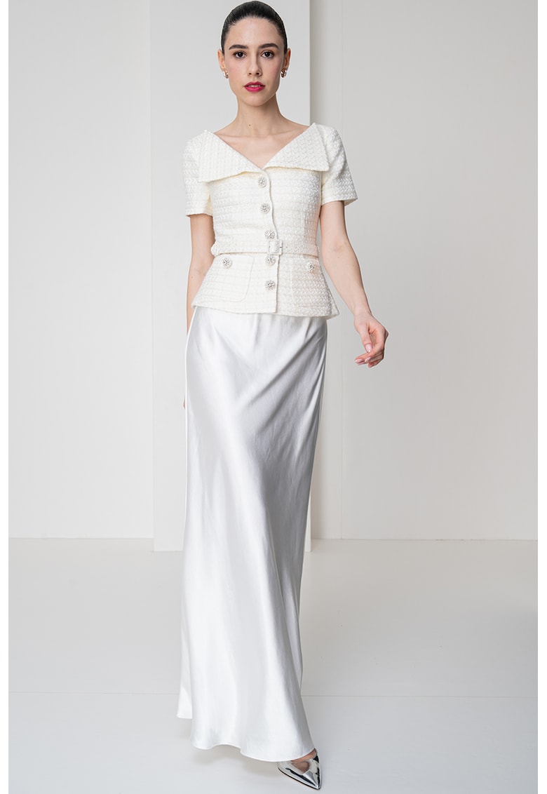 Caracteristici Culoare: crem Stil: elegant Material: acril Imprimeu: uni Croiala: in a Lungime: lunga Guler: ascutit Lungime maneca: maneca scurta Detalii: terminatie evazata Compozitie Exterior: 63% acril