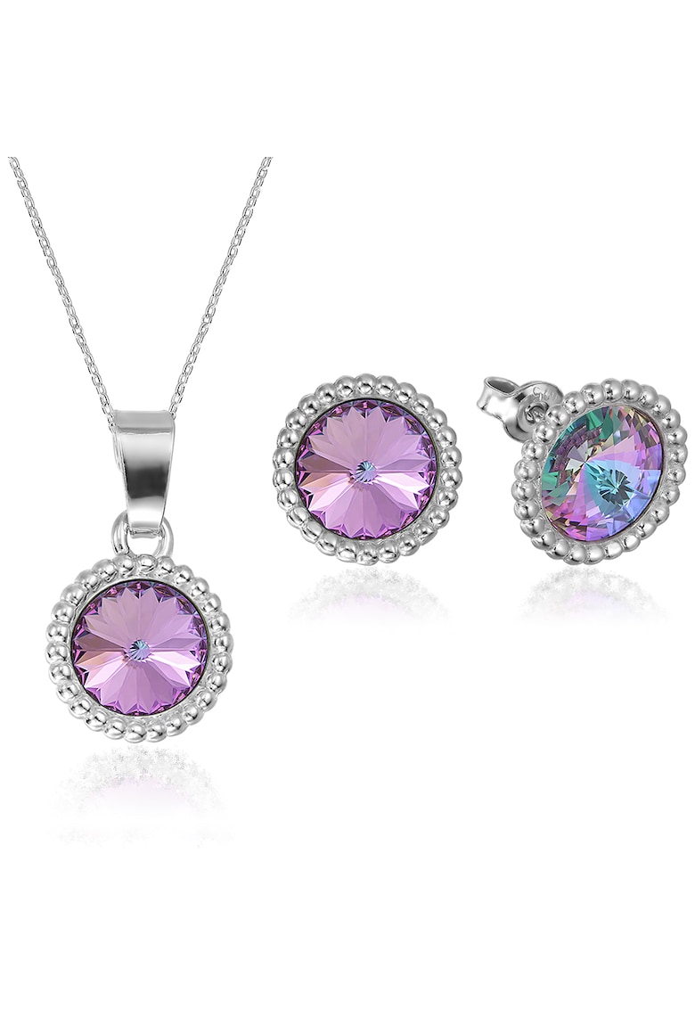 Caracteristici Tip produs: set Material: argint Culoare: lila Continut pachet: 1 set Detalii: cristale Sistem inchidere: tija si surub Linie Brand: e-crystal Ambalaj: cutie de bijuterii Compozitie Compozitie: argint 925 Pietre: swarovski Dimensiuni Lungime: 42 cm