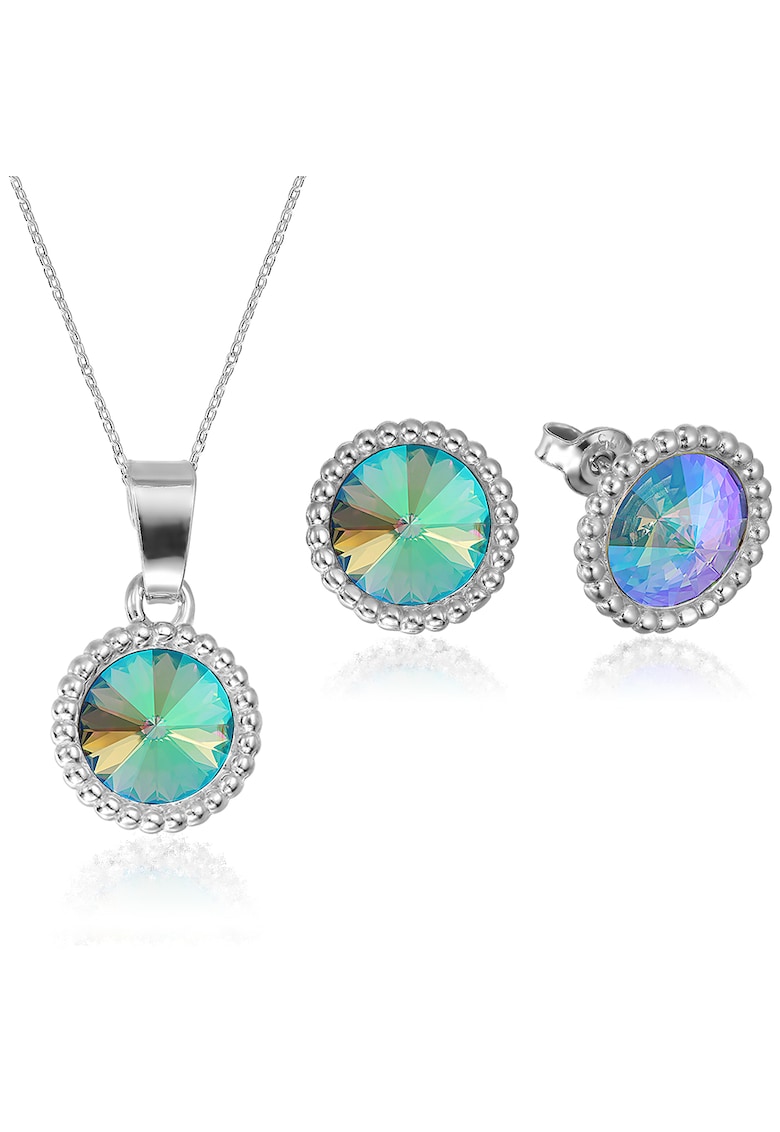 Caracteristici Tip produs: set Material: argint Culoare: iridescent Continut pachet: 1 set Detalii: cristale Sistem inchidere: tija si surub Linie Brand: e-crystal Ambalaj: cutie de bijuterii Compozitie Compozitie: argint 925 Pietre: swarovski Dimensiuni Lungime: 42 cm