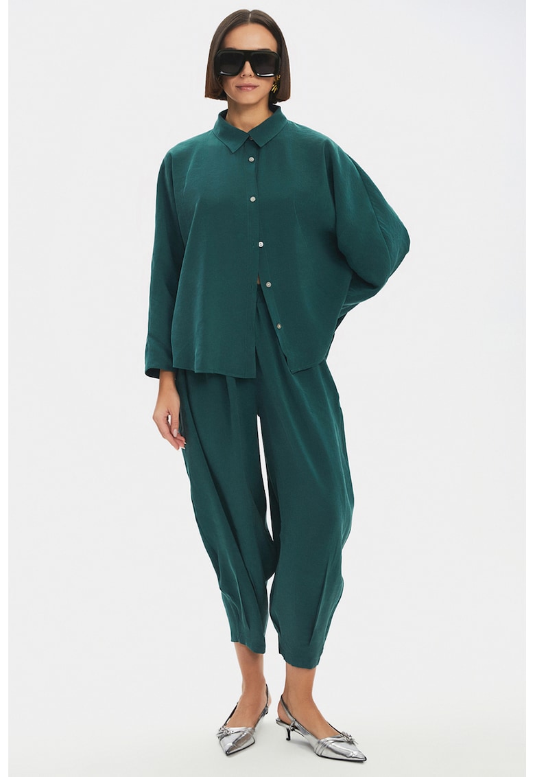 Caracteristici Continut pachet: camasa si pantaloni Culoare: verde Imprimeu: uni Material: viscoza Stil: casual Croiala: lejer Guler: ascutit Lungime maneca: maneca lunga Sistem inchidere: nasturi Compozitie Exterior: 80% viscoza