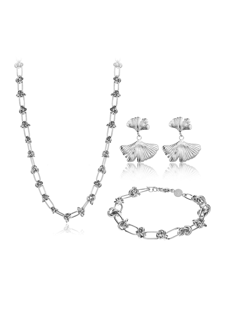Caracteristici Tip produs: set Material: inox Culoare: argintiu Continut pachet: 1 bratara + 1 colier + cercei Detalii: design cu lant