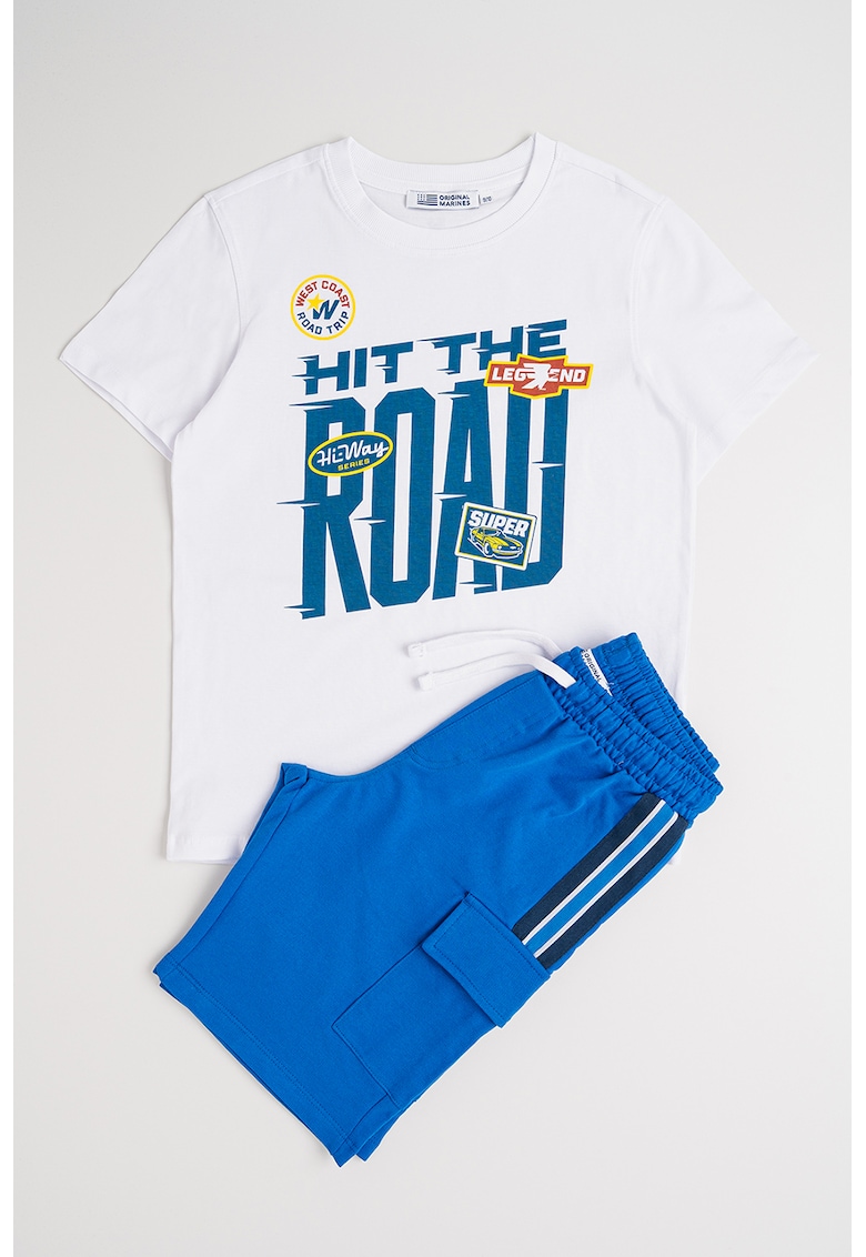 - albastru deschis Stil: casual Imprimeu: text Croiala: regular fit Material: bumbac Sistem inchidere: fara inchidere Decolteu: la baza gatului Lungime maneca: maneca scurta Lungime pantaloni: scurti Buzunare: 2 cu clapa Detalii: snur pentru ajustare in talie Colectie: primavara