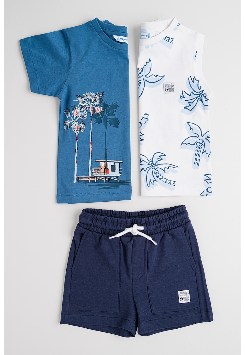 - albastru Stil: casual Imprimeu: tropical Croiala: regular fit Material: bumbac Sistem inchidere: snur Decolteu: la baza gatului Lungime maneca: fara maneca
