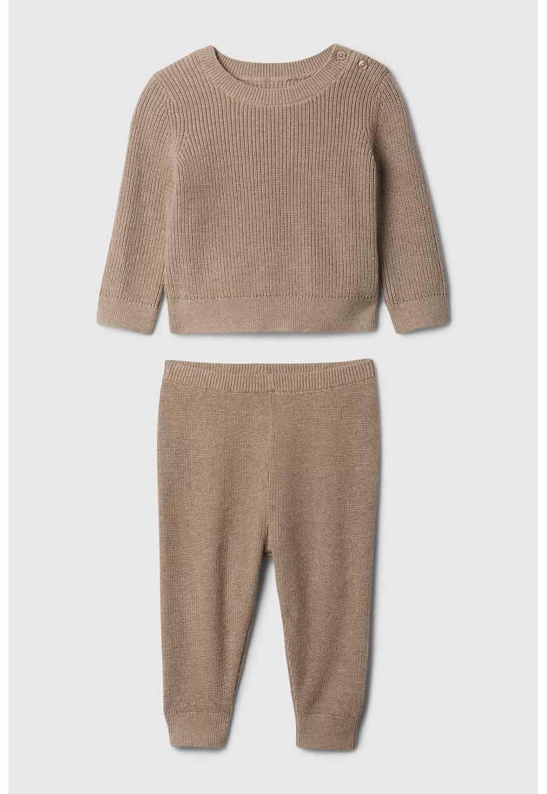 Caracteristici Continut pachet: pulover si p pereche de pantaloni Culoare: maro taupe Stil: casual Imprimeu: uni Croiala: regular fit Material: bumbac Sistem inchidere: fara inchidere Decolteu: la baza gatului Lungime maneca: maneca lunga Lungime pantaloni: lungi Colectie: primavara