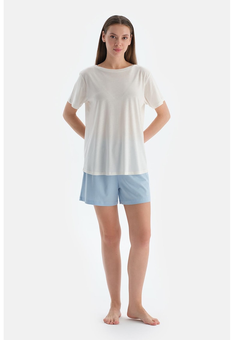 - albastru lavanda Material: bumbac Imprimeu: uni Decolteu: decolteu la baza gatului Croiala: regular fit Lungime maneca: maneca scurta Talie: regular Lungime pantaloni: scurti Sistem inchidere: fara inchidere Compozitie Exterior: 50% bumbac