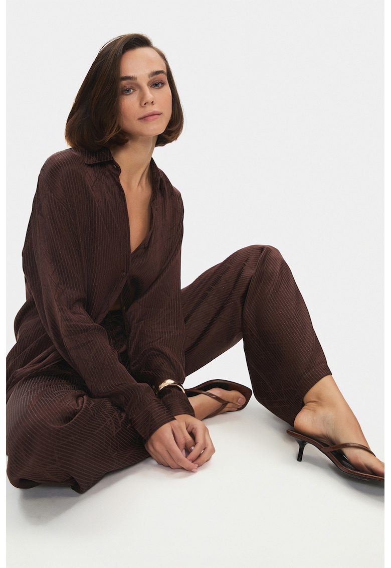 Caracteristici Continut pachet: camasa si pantaloni Culoare: maro inchis Imprimeu: dungi Material: viscoza Stil: elegant Croiala: croiala ampla Guler: clasic Maneci: cu mansete cu nasturi Lungime maneca: maneca lunga Talie: inalta Buzunare: in cusaturile laterale Detalii: snur pentru ajustare si insertie elastica in talie Sistem inchidere: nasturi Compozitie Exterior: 49% raion