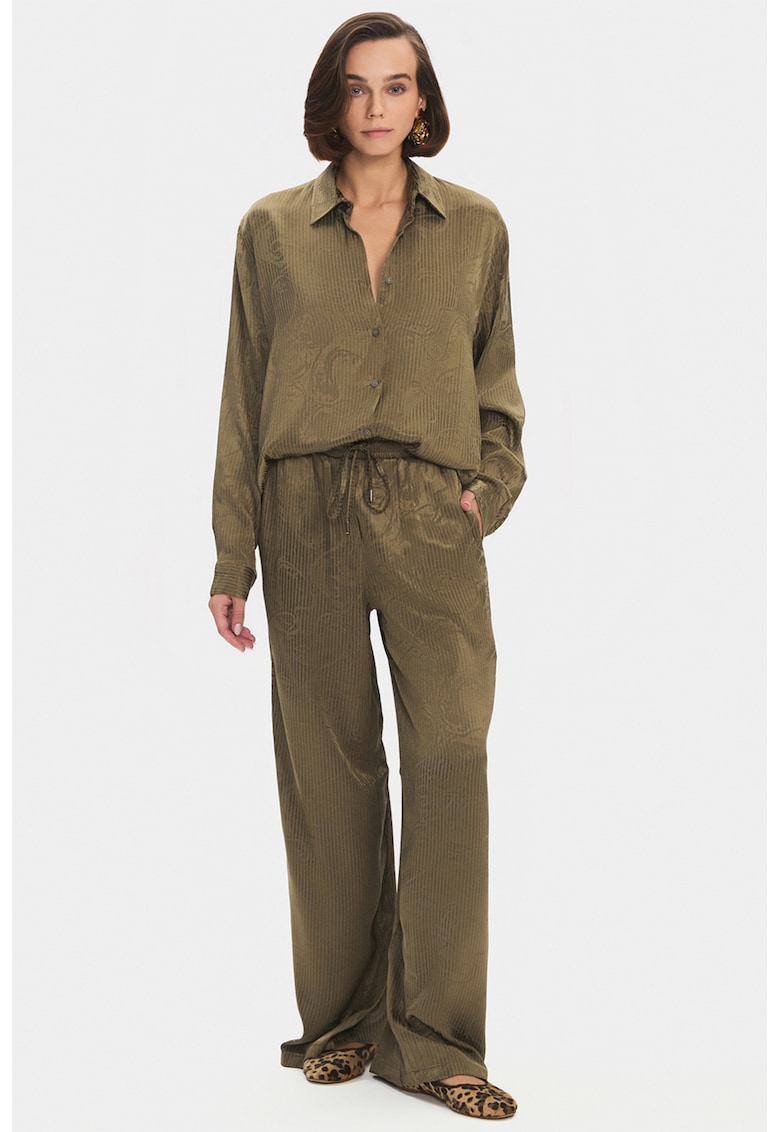 Caracteristici Continut pachet: camasa si pantaloni Culoare: kaki Imprimeu: dungi Material: viscoza Stil: elegant Croiala: croiala ampla Guler: clasic Maneci: cu mansete cu nasturi Lungime maneca: maneca lunga Talie: inalta Buzunare: in cusaturile laterale Detalii: snur pentru ajustare si insertie elastica in talie Sistem inchidere: nasturi Compozitie Exterior: 49% raion
