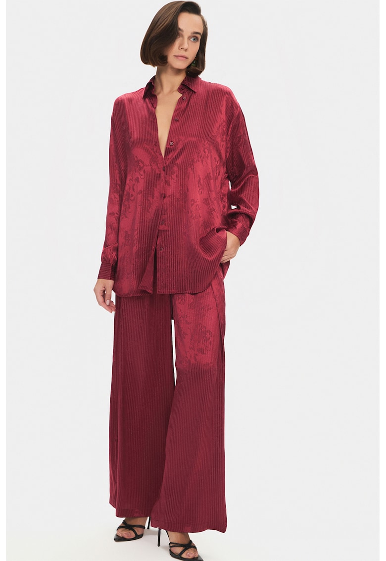 Caracteristici Continut pachet: camasa si pantaloni Culoare: visiniu Imprimeu: dungi Material: viscoza Stil: elegant Croiala: croiala ampla Guler: clasic Maneci: cu mansete cu nasturi Lungime maneca: maneca lunga Talie: inalta Buzunare: in cusaturile laterale Detalii: snur pentru ajustare si insertie elastica in talie Sistem inchidere: nasturi Compozitie Exterior: 49% raion
