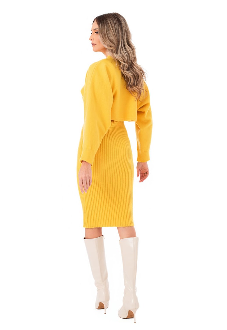 Caracteristici Continut pachet: rochie si bluza Culoare: galben sofran Imprimeu: uni Material: poliester