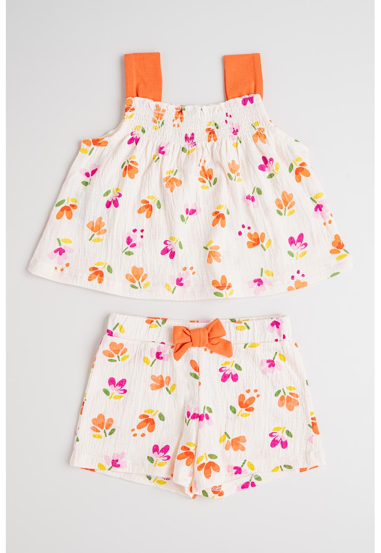 - portocaliu mandarina Stil: casual Imprimeu: floral Croiala: regular fit Material: bumbac Sistem inchidere: fara inchidere Lungime maneca: fara maneca Lungime pantaloni: scurti Detalii: funda Colectie: primavara