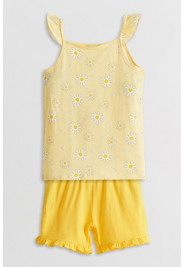 - galben pal Stil: casual Imprimeu: floral Croiala: regular fit Material: bumbac Sistem inchidere: fara inchidere Decolteu: patrat Lungime maneca: fara maneca Lungime pantaloni: scurti Detalii: insertii cu volane Colectie: primavara