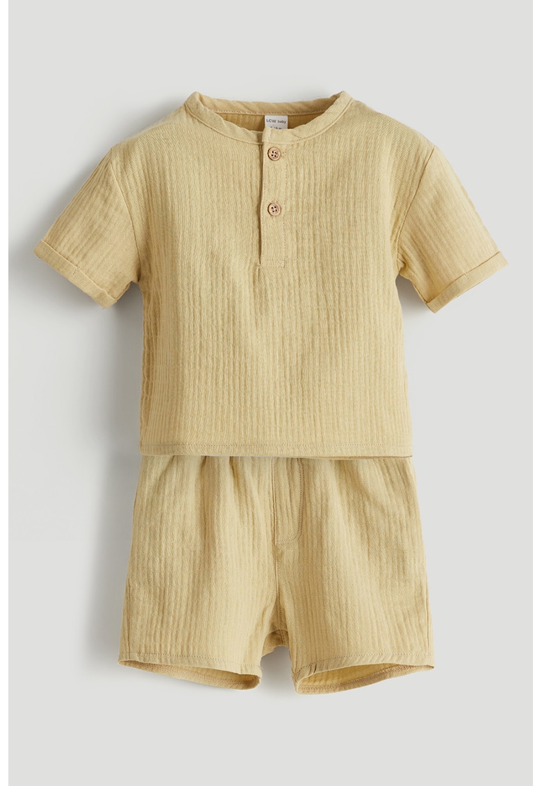 Caracteristici Culoare: camel Stil: casual Imprimeu: uni Croiala: regular fit Material: bumbac Sistem inchidere: fara inchidere Decolteu: la baza gatului Lungime maneca: maneca scurta Lungime pantaloni: scurti Detalii: talie elastica