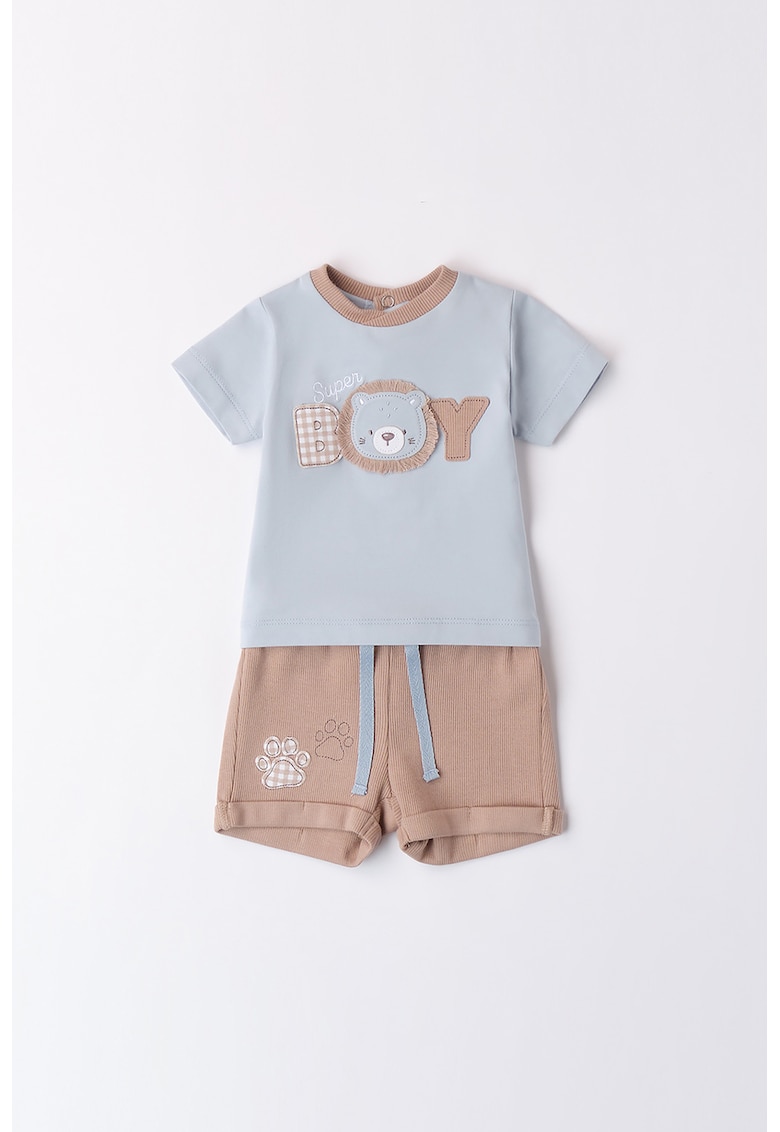 Caracteristici Continut pachet: tricou si pantaloni scurti Culoare: albastru prafuit