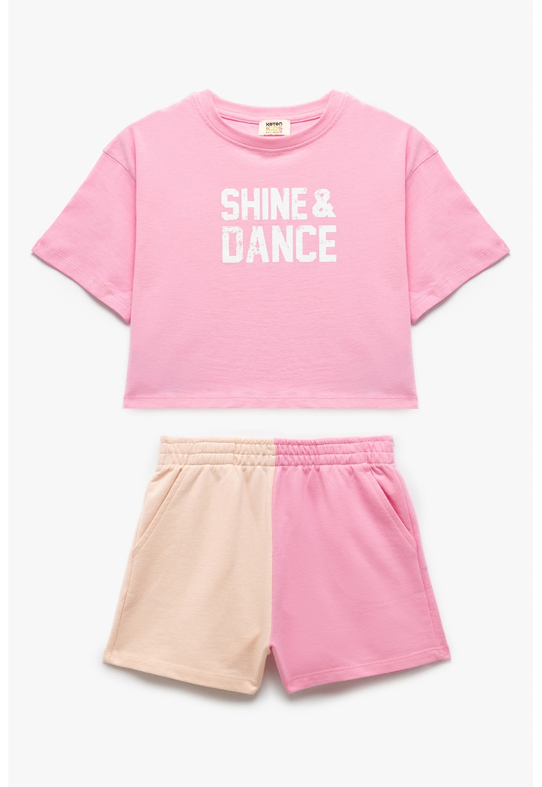 - roz Stil: casual Imprimeu: text Croiala: regular fit Material: bumbac Sistem inchidere: fara inchidere Decolteu: decolteu la baza gatului Maneci: maneci cazute Lungime maneca: maneca scurta Lungime pantaloni: scurti Compozitie Exterior: 100% bumbac