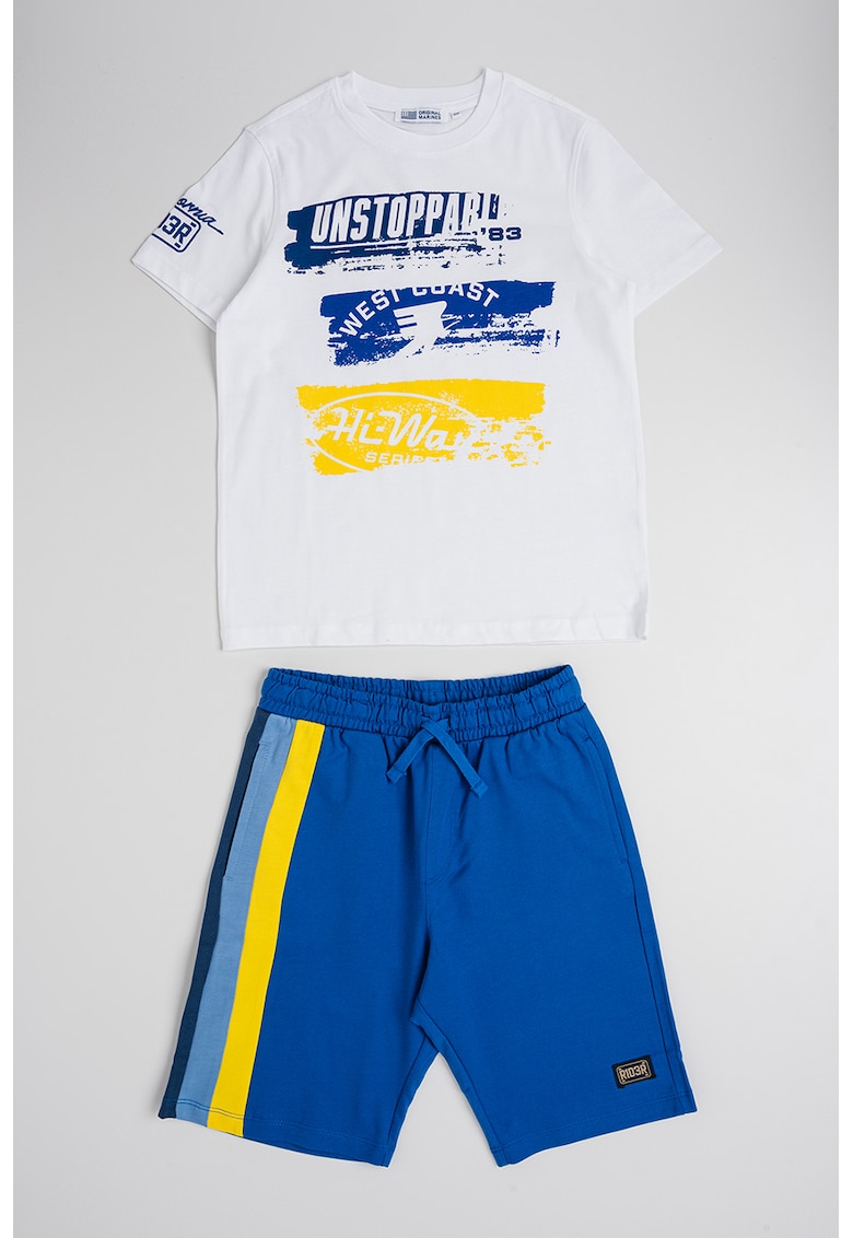 - alb optic Stil: casual Imprimeu: text Croiala: regular fit Material: bumbac Decolteu: rotund Lungime maneca: maneca scurta Lungime pantaloni: scurti Buzunare: unul aplicat
