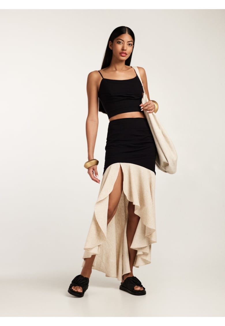 Caracteristici Continut pachet: top si fusta Culoare: negru Imprimeu: uni Material: bumbac Stil: casual Croiala: lejer Lungime maneca: fara maneca Detalii: asimetric Sistem inchidere: fermoar Compozitie Exterior: 75% in 25% bumbac Captuseala: 100% bumbac