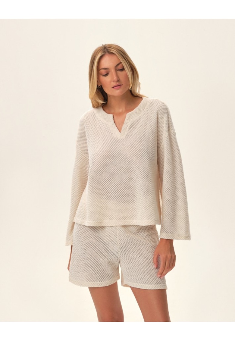 Caracteristici Culoare: alb crem Imprimeu: uni Material: poliester Croiala: regular fit Lungime maneca: maneca lunga Buzunare: fara buzunare Talie: medie Detalii: talie elastica Sistem inchidere: fara inchidere Continut pachet: 1 bluza si 1 pantalon scurt