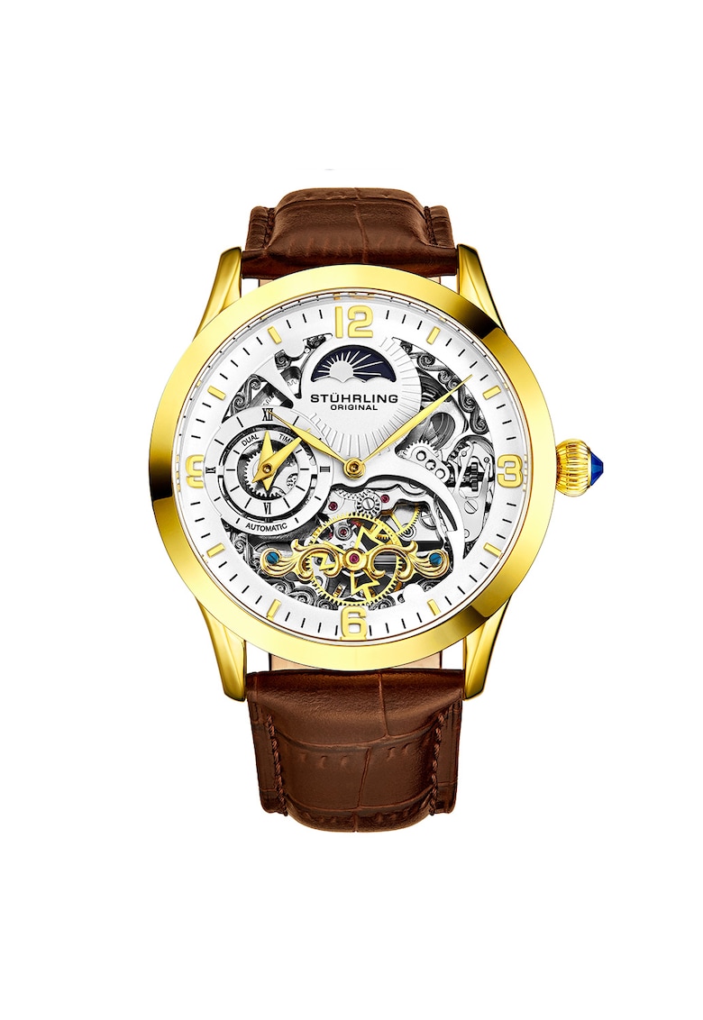 - dual time Cadran Material geam: cristal mineral Carcasa Forma carcasa: rotunda Material carcasa: inox Culoare carcasa: auriu Diametru carcasa: 44 mm Curea/bratara Tip: curea Material curea/bratara: piele naturala Culoare curea/bratara: maro