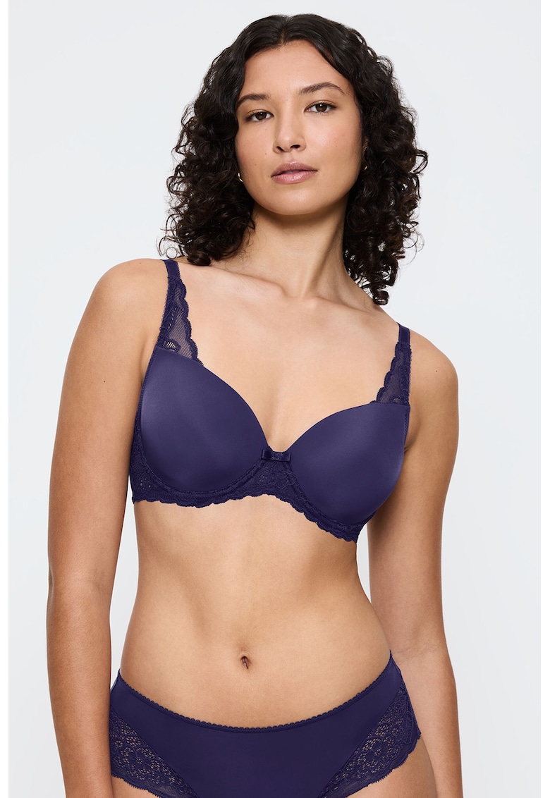 Caracteristici Tip produs: sutien Culoare: bleumarin Material: sintetic Imprimeu: uni Barete: ajustabile Forma cupa: acoperire completa Burete cupa: cu burete Sustinere metalica: cu sarma Detalii: terminatii valurite Sistem inchidere: tija si anou Compozitie Exterior: 60% poliamida