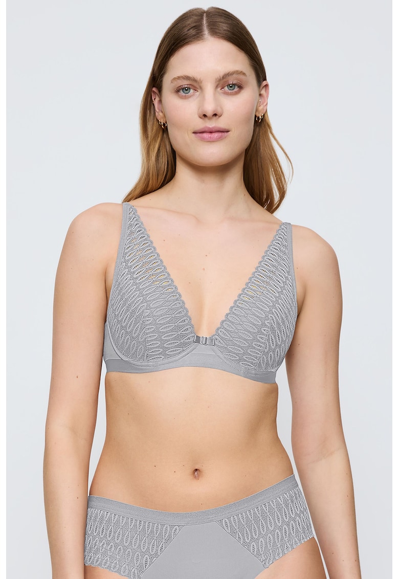 Caracteristici Tip produs: sutien Culoare: gri deschis Material: sintetic Imprimeu: floral Barete: ajustabile Forma cupa: triunghiulara Burete cupa: cu burete Sustinere metalica: cu sarma Sistem inchidere: tija si anou Compozitie Exterior: 60% poliamida