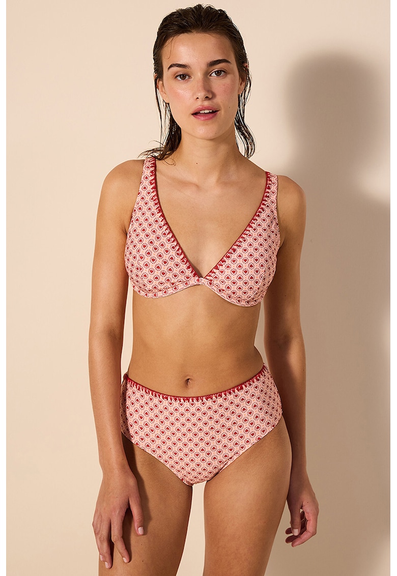 - rosu inchis Imprimeu: floral Forma cupa: triunghi Material: sintetic Barete: ajustabile Sistem inchidere: clema Design Tip sutien: burete detasabil Sustinere metalica: cu sarma Stil decolteu: v Compozitie Exterior: 80% poliester reciclat 20% elastan